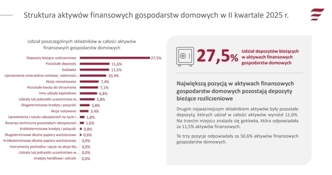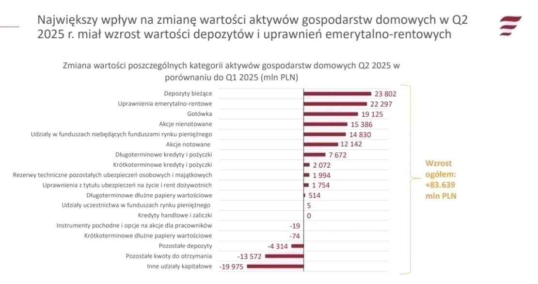 • Największy wzrost wartości aktywów odnotowano w depozytach bieżących (+23,8 mld PLN), uprawnieniach emerytalno-rentowych (+22,3 mld PLN) oraz gotówce (+19,1 mld PLN).