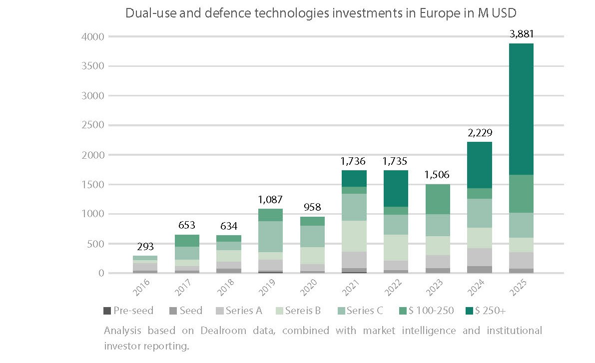 Według danych z raportu, od 2016 roku prywatne inwestycje w europejskie firmy dual-use i obronne wyniosły 14,76 mld USD, z czego ponad 9,35 mld USD napłynęło po rozpoczęciu pełnoskalowej wojny w Ukrainie. Tylko w 2025 roku wartość inwestycji sięgnęła 3,88 mld USD, co stanowi najwyższy poziom w historii tego rynku.