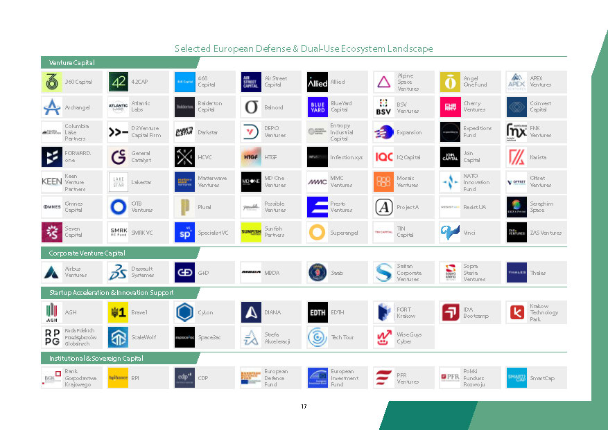 Nowe wydanie prezentuje mapę europejskiego ekosystemu inwestorów, funduszy i akceleratorów – od programów takich jak NATO DIANA i FORT Kraków, po fundusze venture capital wspierane przez PFR Ventures, EIF, czy korporacje technologiczne, takie jak Airbus i Thales.