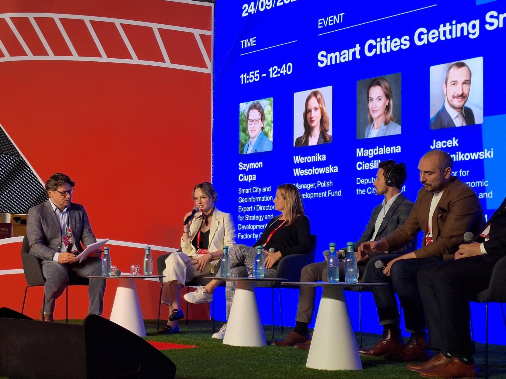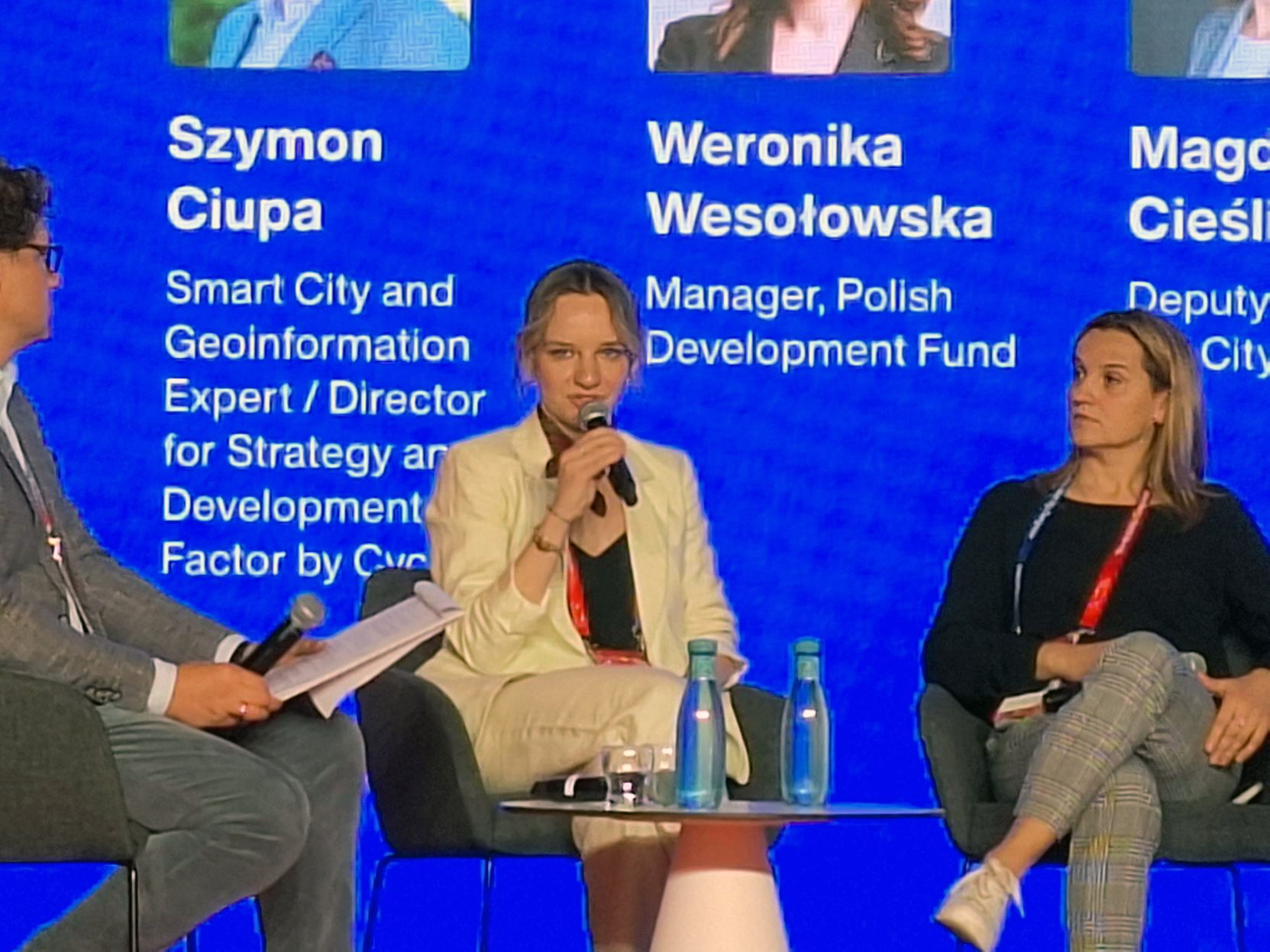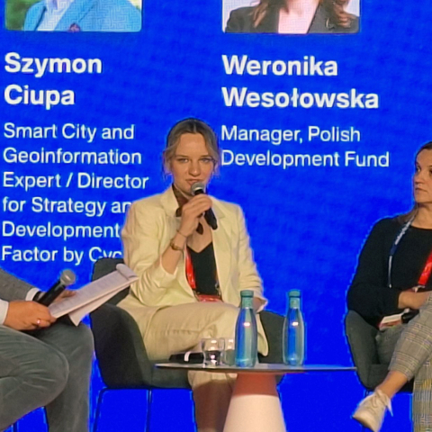 W panelu „Smart Cities Getting Smarter: ewolucja inteligentnych rozwiązań miejskich” głos zabrała Weronika Wesołowska, menedżerka w zespole PFR dla Miast. Podczas dyskusji podzieliła się doświadczeniami z projektów realizowanych wspólnie z samorządami, jak np. Urban Tech Hub, których celem jest tworzenie przestrzeni do dialogu między firmami technologicznymi i samorządowcami.