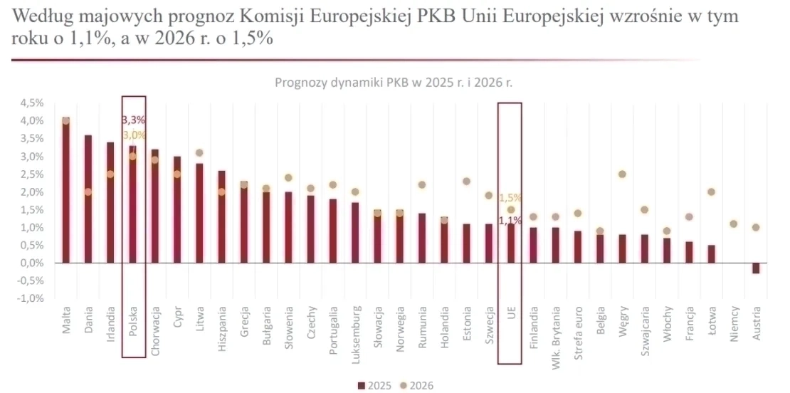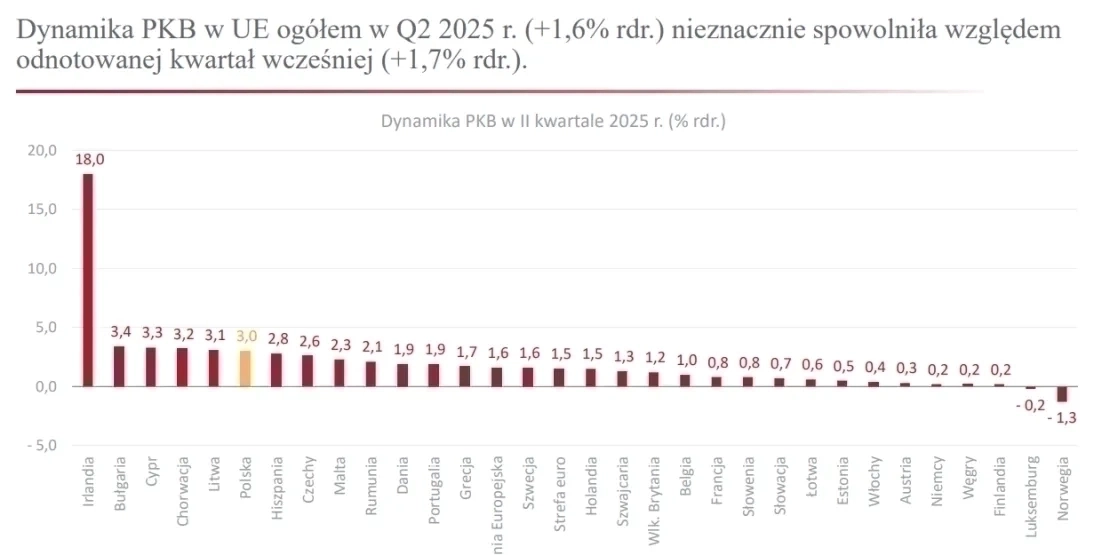 • W Polsce dynamika PKB w II kw. 2025 r. ukształtowała się na poziomie +3,0% rdr., w porównaniu do +3,7% rdr. kwartał wcześniej. Polski wynik był szóstym największym wzrostem spośród krajów UE i EFTA.