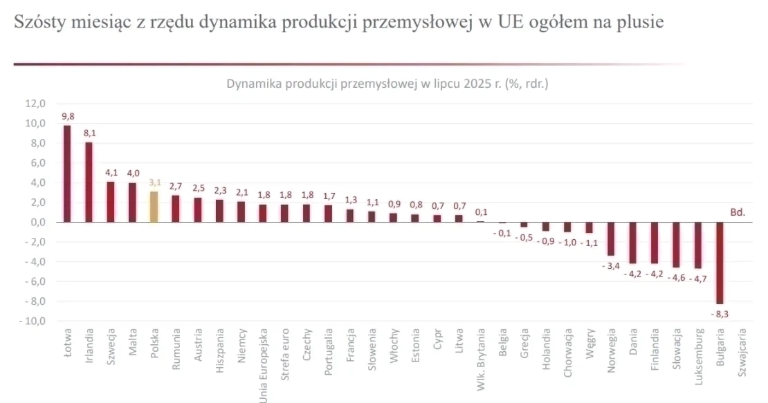 • Wzrost gospodarczy w Q2 2025 r. w UE ogółem (+1,6% rdr.) był nieznacznie niższy od odnotowanego kwartał wcześniej (+1,7% rdr.).