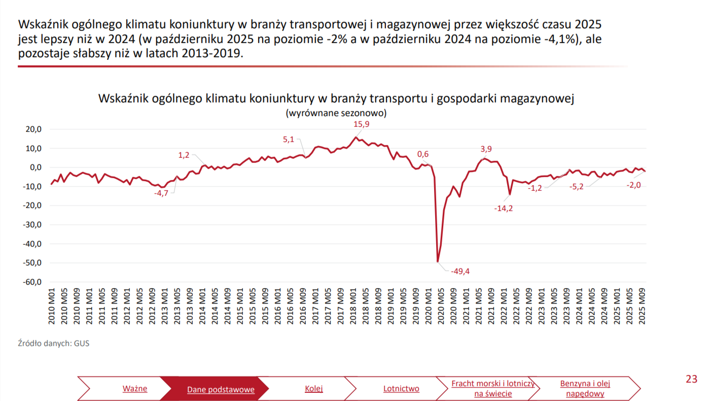 wskaźnik ogólnego klimatu koniunktury w branży transportowej i magazynowej przez większość czasu 2025 jest lepszy niż w 2024 (w październiku 2025 na poziomie -2% a w październiku 2024 na poziomie -4,1%), ale pozostaje słabszy niż w latach 2013-2019.