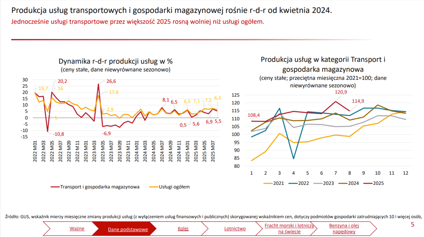 Produkcja usług transportowych i gospodarki magazynowej rośnie r-d-r nieprzerwanie od kwietnia 2024 (najświeższe dane z sierpnia 2025 wskazują wzrost o +5,5%).