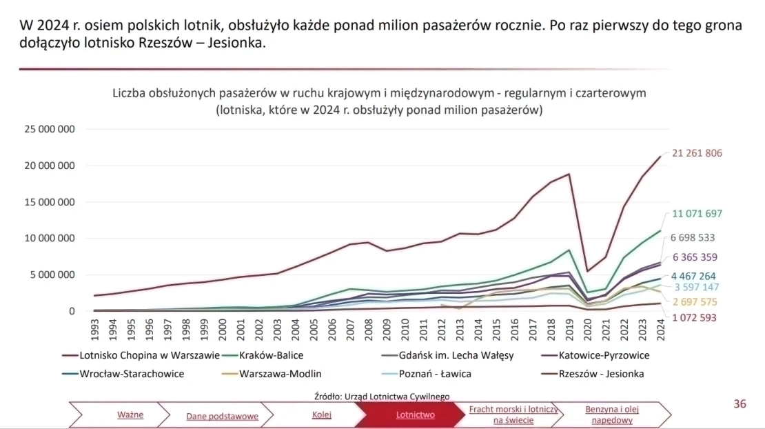 - na poprawę atrakcyjności kolej jako środka transportu wpływa m.in. wzrost długość linii kolejowych (w 2024 r. 19 663 km, najwięcej od 2014); wyższa dopuszczalna prędkość przejazdów (udziału torów kolejowych z dopuszczalną prędkością powyżej 120 km/h wzrósł do 21,6% w 2024 z 11,8% w 2014 r, modernizacja taboru oraz dworców kolejowych.