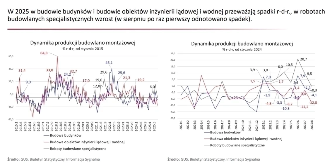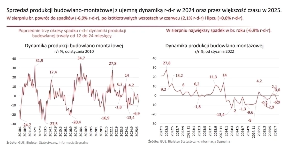 • Utrzymuje się spowolnienie w produkcji budowlano-montażowej, które rozpoczęło się w 2024 i trwa przez większość miesięcy 2025: o w sierpniu 2025 odnotowano największy spadek produkcji budowlano-montażowej w br. (-6,9% r-d-r), po krótkotrwałych wzrostach w czerwcu i lipcu br.