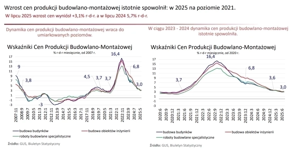 • W sierpniu 2025 - po raz pierwszy w tym roku, ujemna dynamika produkcji r-d-r objęła wszystkie kategorie budów: o do spadków dołączyły roboty budowlane specjalistyczne (-0,3% r-d-r), które przez wcześniejsze miesiące br. rosły.